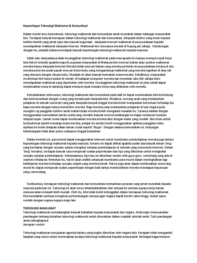 Teknologi maklumat sememangnya terkenal dengan keupayaan perantinya untuk menghubungan individu yang berjauhan walaupun berjuta batu dan berada di negara yang berlainan. Contoh Karangan Bahasa Melayu BM Tingkatan 1 2 3.